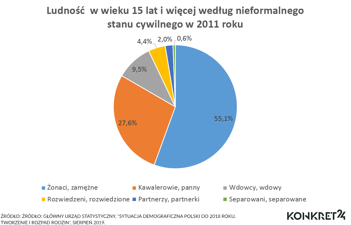 Opracowanie "Sytuacja demograficzna Polski do 2018 roku. Tworzenie i rozpad rodzin"[6] z roku 2011 pokazuje, że większość dorosłych Polaków (55% osób, czyli 18 mln) jest w związkach małżeńskich. Tak przynajmniej deklaruje. Z pozostałych 27,6% to panny albo kawalerowie, reszta to wdowcy albo rozwiedzeni. (rys 1).