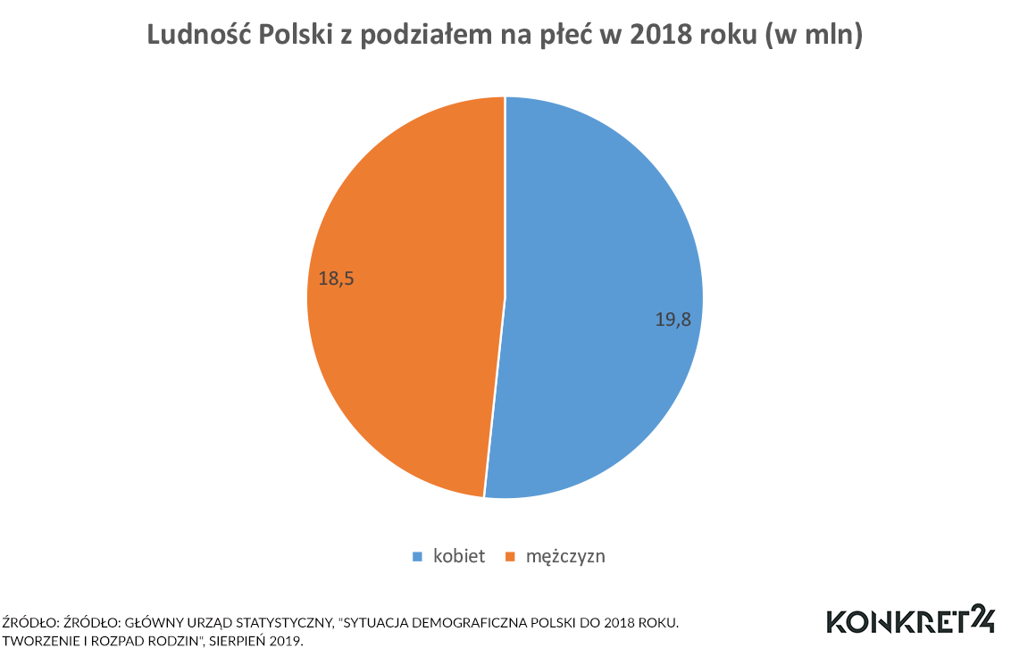 Kobiet w Polsce jest więcej. Kobiety statystycznie żyją dłużej i w efekcie więcej jest starszych pań, niż starszych panów. Dane GUS pokazują, że w 2018 roku w Polsce kobiet było ponad 19 mln, a mężczyzn prawie o milion mniej (rys.2).