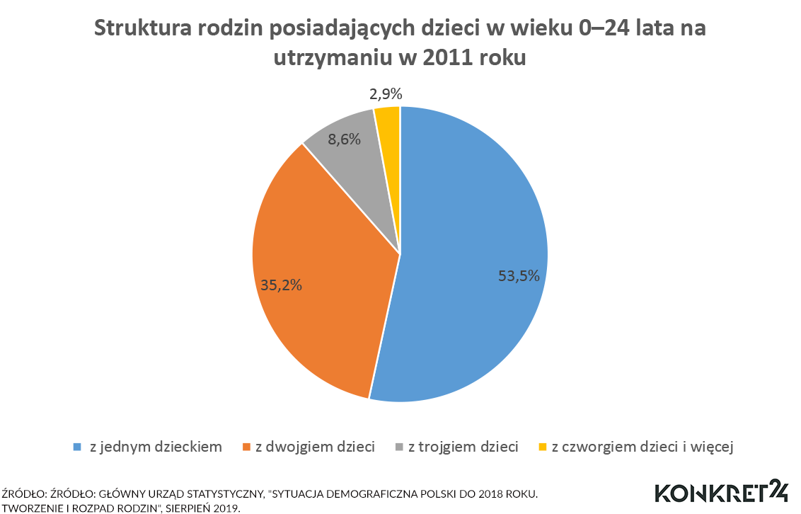W 2011 roku większość rodzin w Polsce stanowiły rodziny z jednym dzieckiem (53%). 35% to rodziny z dwójką dzieci, a jedynie 8,6% w skali kraju to rodziny wielodzietne, czyli z trojgiem dzieci (w Polsce wielodzietność liczona jest właśnie od trójki dzieci). Rodzin wysoko wielodzietnych, czyli wychowujących co najmniej czworo dzieci jest jeszcze mniej- zaledwie 2.9 %. Są to dane prezentujące liczbę dzieci w rodzinach, które takowe posiadają, a nie w rodzinach w Polsce ogółem. Dalsze dane GUS pokazują, że małżeństw bez dzieci jest w Polsce ok 24%, czyli obiektywnie bardzo dużo.