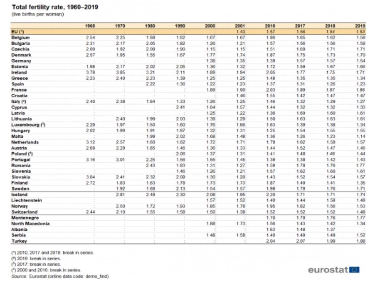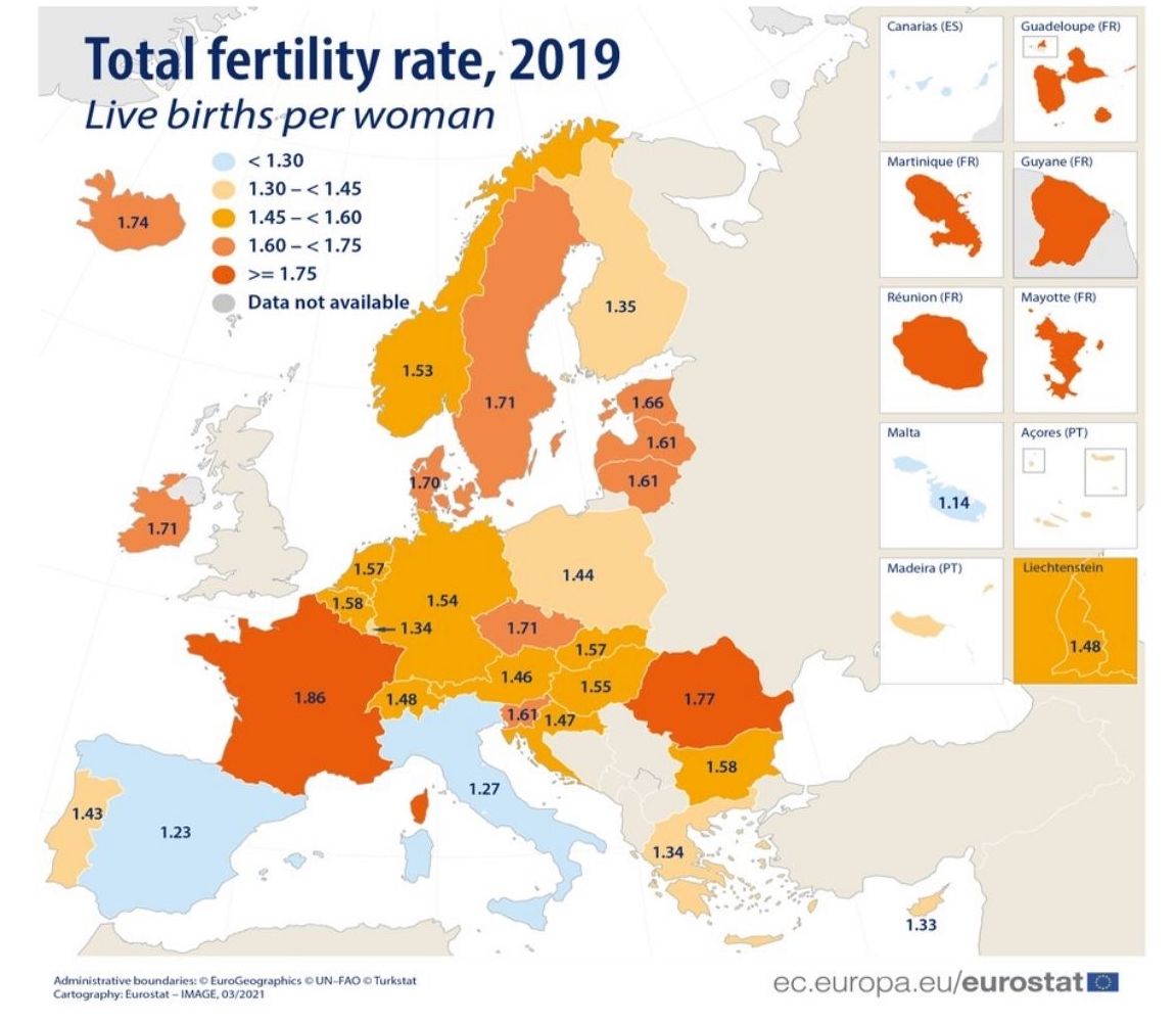 W 2019 roku kraje z najniższym współczynnikiem dzietności to: Malta (1,14), Hiszpania (1,23), Włochy (1,27), Cypr (1.33), Grecja i Luksemburg (1.34), zaś z najwyższym - Francja (1,86), Rumunia (1.77), Irlandia i Szwecja (1,71), Dania (1,70). W Polsce wartość tego wskaźnika w 2019 r. też jest niska- wynosi jedynie 1,44. W żadnym z badanych przez Eurostat krajów wskaźnik dzietności nie osiągnął poziomu zastępowalności pokoleń (czyli 2.1 dziecka na kobietę w wieku rozrodczym). Jednak widzimy, że to nie w katolickiej Polsce, tylko w zlaicyzowanych Francji i Szwecji rodzi się najwięcej dzieci; i warto by zadać sobie pytanie dlaczego tak się dzieje.