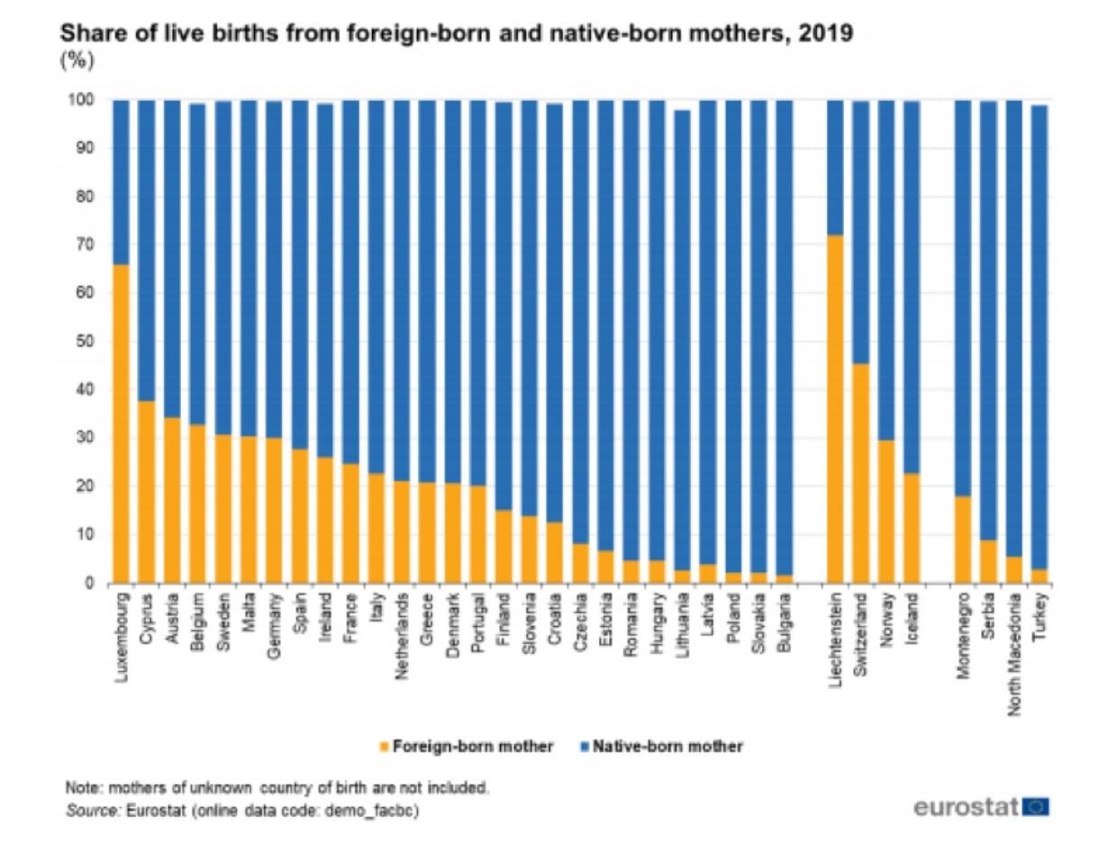 Widzimy, że w takich krajach jak Cypr, Austria i Belgia liczba urodzeń przez matki pochodzących z innych krajów kształtuje się na poziomie 1/3. W pozostałych krajach Europy Zachodniej – waha się miedzy 25%, a 35%. Z kolei w Polska, Bułgaria, Słowacja, na Litwa znajdują na drugim biegunie- tu rodzą przede wszystkim ‘matki rdzenne’- kobiety pochodzące z kraju urodzenia swojego dziecka. Natomiast najwięcej urodzeń przez ‘matki imigrantki’ ma miejsce w Luksemburgu- nawet 60% i Szwajcarii- 45%. Jeśli te tendencje będą się utrzymywać w przyszłości, co jest prawdopodobne, to bogate kraje Europy Zachodniej staną się w przyszłości społeczeństwami, w których coraz więcej ról społecznych odgrywać będą imigranci.