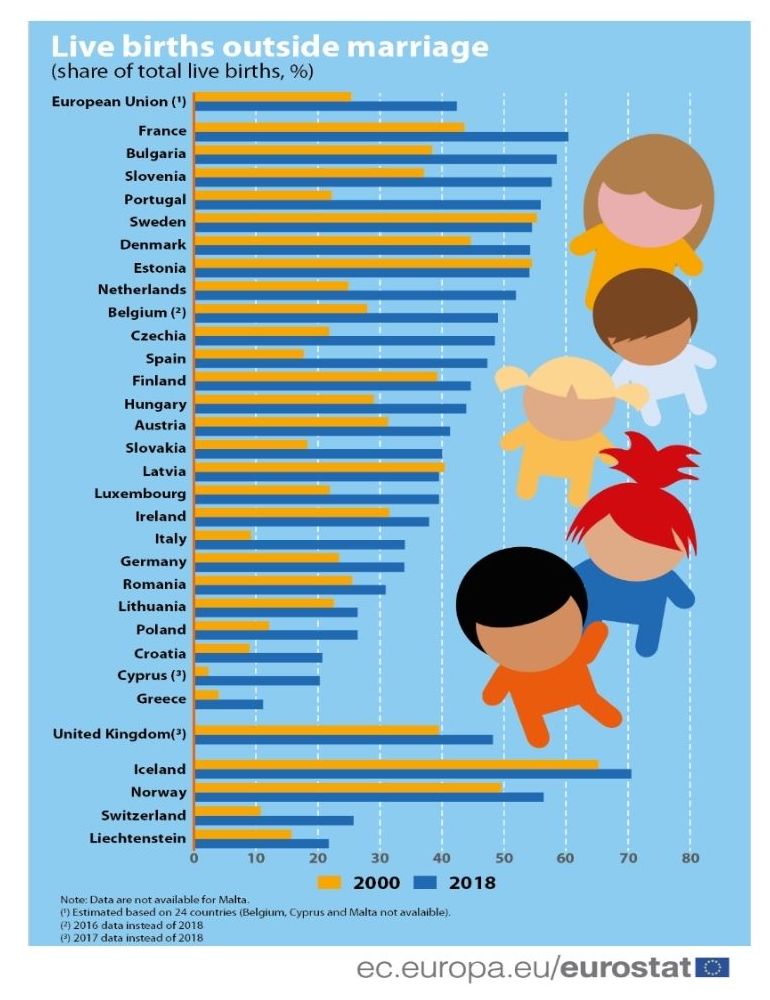 Widzimy, że tendencje na przestrzeni prawie 20 lat znacząco się pogłębiają- nie w Polsce liczba urodzeń pozamałżeńskich wzrosła prawie dwukrotnie. Francja jest zaś krajem, w którym liczba dzieci urodzonych poza małżeństwem sięga 60% i jest to najwyższa wartość w UE. Oznacza to prawdopodobnie dwie kwestie- 1. przemiany cywilizacyjne, przemiany mentalnościowe sprawią, że tradycyjna rodzina przejdzie do lamusa i będzie fenomenem coraz rzadziej spotykanym, 2. Francja, która jest krajem o najwyższym wskaźniku dzietności ma liczbę również najwyższą liczbę urodzeń pozamałżeńskich –czyli skoro rodzące nie znajdują oparcia w instytucji rodziny, muszą mieć zapewnioną opiekę ze strony państwa.
