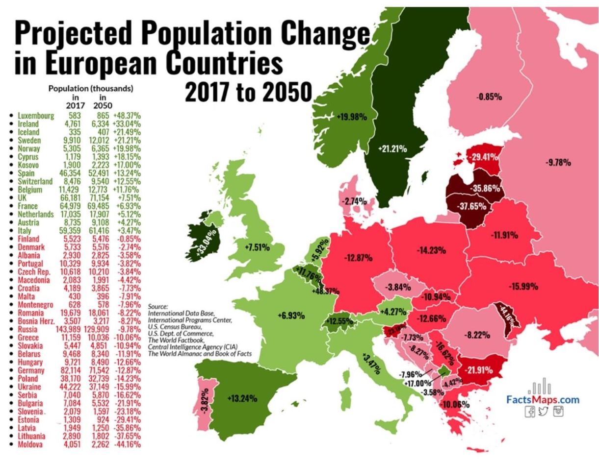 Jeśli obecne trendy demograficzne pozostaną na tym samym poziomie, większa liczba obywateli przybędzie w Irlandii (+33,4%), Szwecji (+21%), Norwegii (+19,9%), Szwajcarii (+12,55%), Belgii (+11,76%). Wielka Brytania i Francja zwiększą liczbę swoich obywateli odpowiednio o 7,5% i 6,9%, podczas gdy Niemcy będą krajem Europy Zachodniej, który straci najwięcej ludności - 12%.
