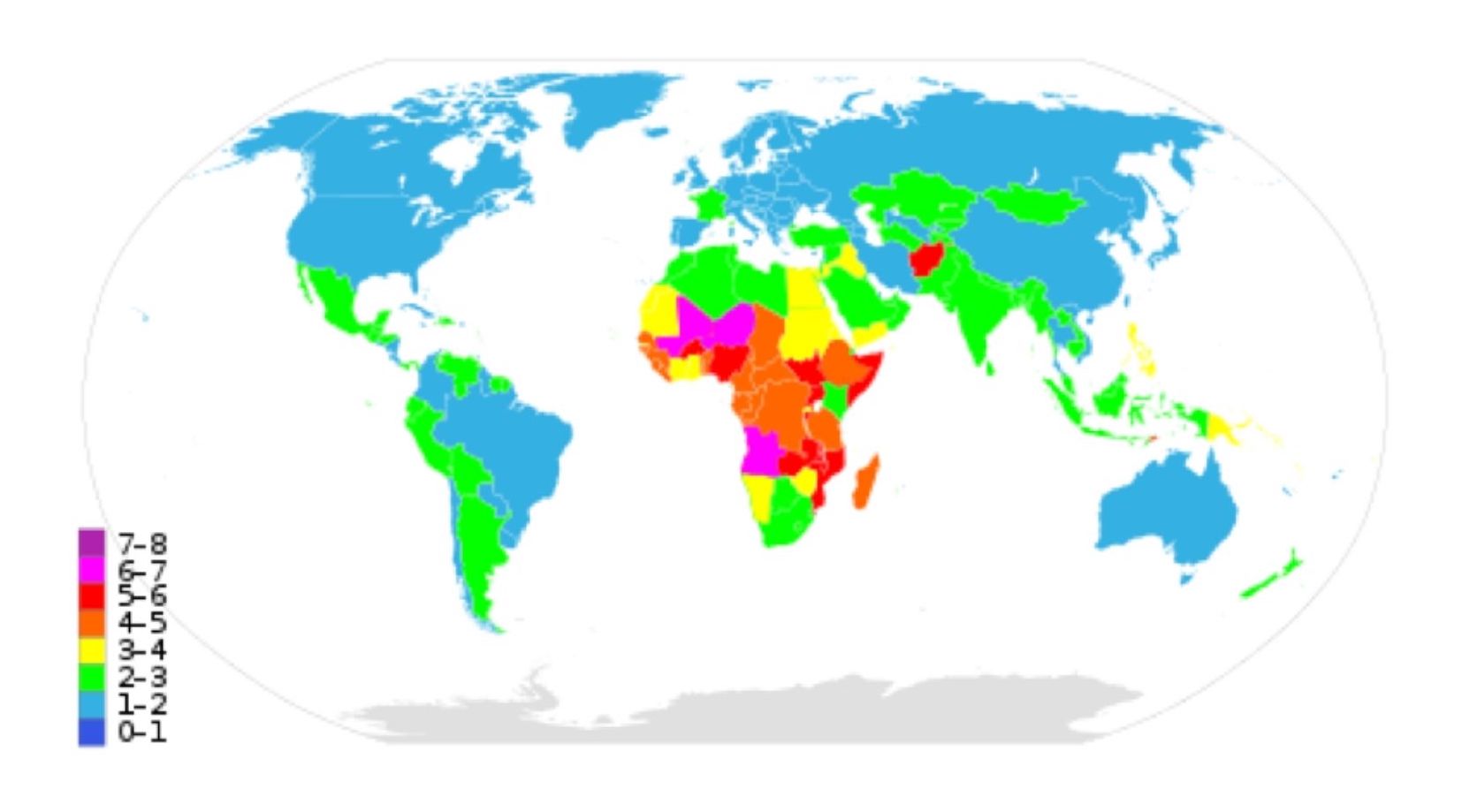 Wzrost liczby ludności nie będzie jednak równomierny. W 2015 r. najwyższy wskaźnik TFR posiadały kraje Afryki Środkowej, w wielu z nich liczba dzieci na kobietę wynosiła 5 lub 6 (co jest trudne do wyobrażenia w krajach europejskich). Kraje lub regiony o stosunkowo wysokim poziomie TFR (2-3 dzieci na kobietę w wieku rozrodczym) - to Ameryka Łacińska i wschodnia część Ameryki Południowej, omawiana wcześniej Francja, Afryka Północna, Afryka Południowa, Turcja, Sudan, Kazachstan, Mongolia, Indie, Indonezja, Nowa Zelandia (mapa 4).