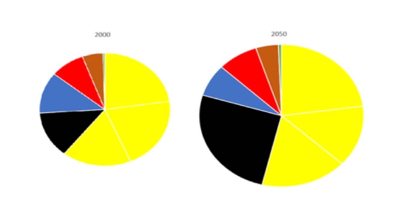 Szacunki ONZ (od 2017 r.) świata według kontynentów w 2000 r. i 2050 r.