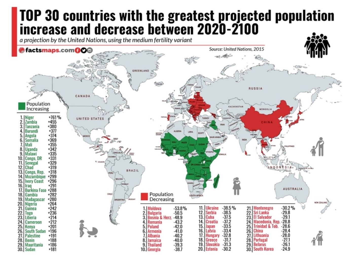 Co ciekawe- Chiny, które przekroczyły 1,39 miliarda mieszkańców w 2017 roku nie są krajem o największym wzroście populacji. Polityka jednego dziecka, wprowadzona w latach 1978–1980 ‘zapobiegła 400 milionom chińskich narodzin’ i sprawiła, że Chiny dołączyły do grupy krajów o najniższym TFR na świecie. Natomiast Indie, które według szacunków ONZ liczyły 1,3 mld osób w 2017 roku mają ludnościowo wyprzedzić Chiny. Przewiduje się że w 2023 roku mają stać się najbardziej zaludnionym krajem na świecie.