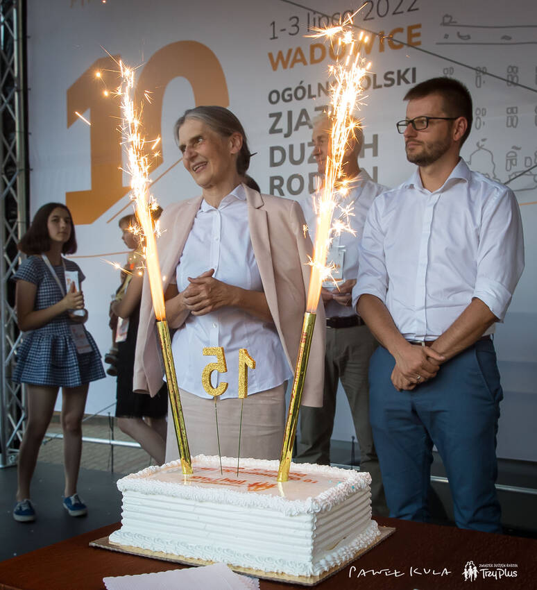 W piątkowy wieczór rodziny, członkowie Związku Dużych Rodzin „Trzy Plus”, wspólnie świętowali 15-lecie istnienia stowarzyszenia i 10-lecie Zjazdów Dużych Rodzin. Było uroczyste przecięcie wstęgi rozpoczynające jubileuszowe spotkanie, a później wspólne „Sto lat…”, tort i kremówki dla każdego uczestnika. Organizatorzy poprosili rodziny o zabranie ze sobą strojów z lat 20 i 30 XX w. - to symbol nawiązujący do lat dzieciństwa przyszłego Papieża. Podczas wieczoru otwarcia rodziny mogły wysłuchać prelekcji o historii Wadowic i wczesnym dzieciństwie Karola Wojtyły.