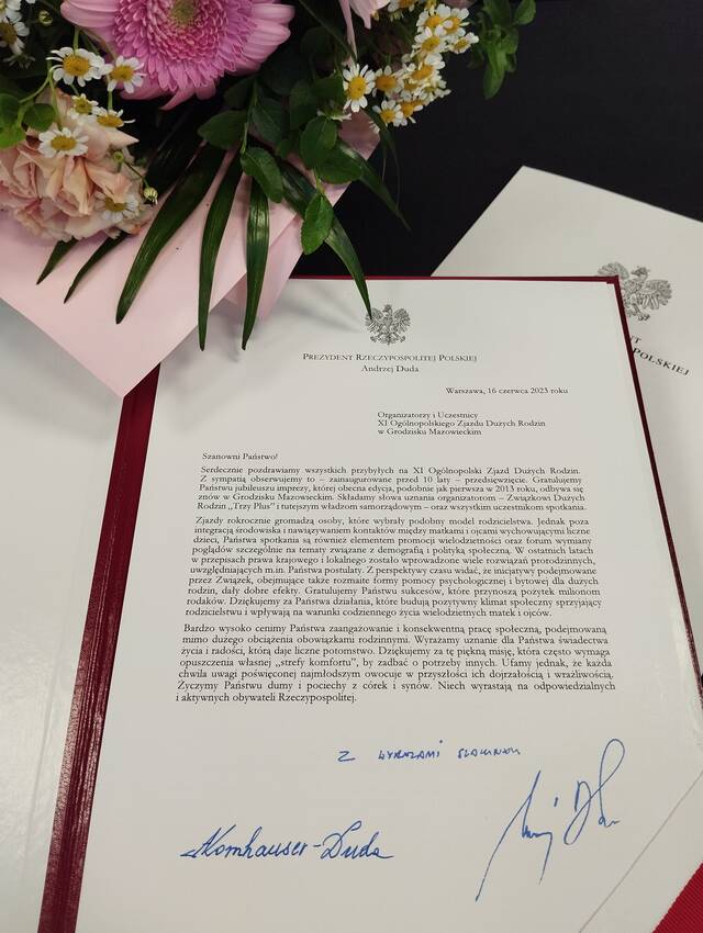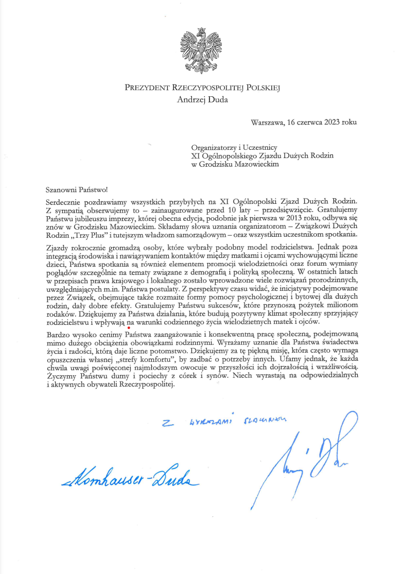Jest nam niezmiernie miło, ponieważ Pan Prezydent Rzeczypospolitej Polskiej Andrzej Duda wraz z małżonką Panią Agatą Kornhauser-Duda skierowali do nas, organizatorów i uczestników XI Zjazdu Dużych Rodzin w Grodzisku Mazowieckim, kilka słów. W związku z tym zjazd odwiedził pan mininster Paweł Szrot, który odczytał list Pary Prezydenckiej.