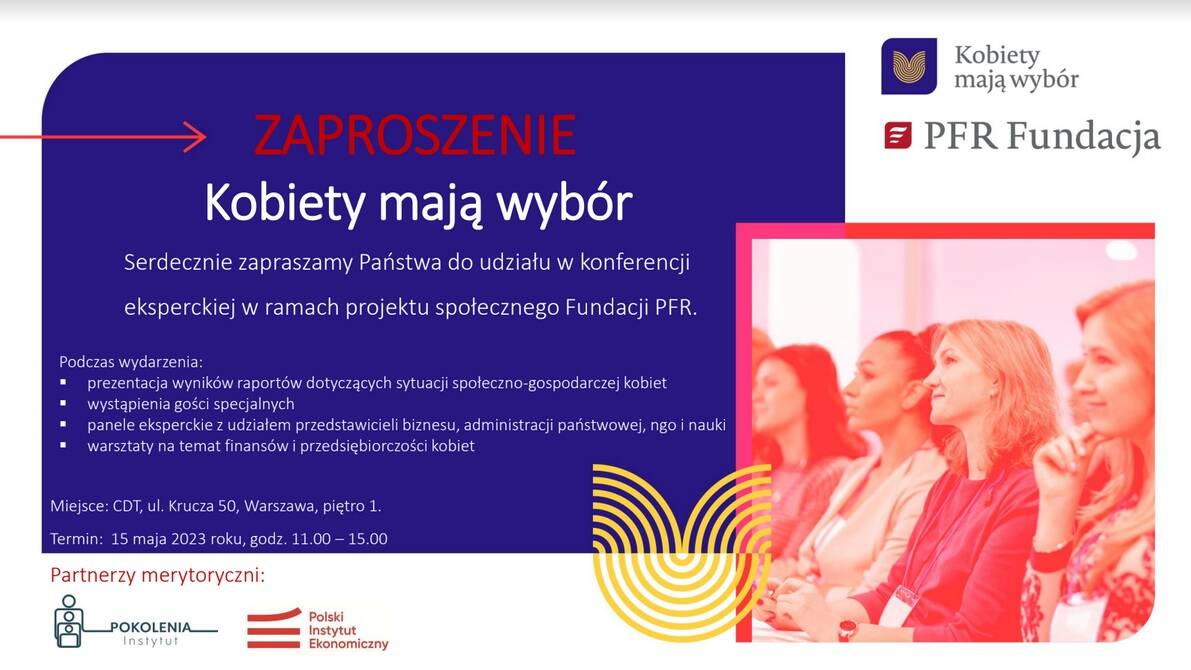 Fundacja Polskiego Funduszu Rozwoju serdecznie zaprasza na Konferencję „Kobiety mają wybór” realizowaną w ramach projektu społecznego Fundacji. Spotkanie odbędzie się w poniedziałek 15 maja 2023 roku o godzinie 11:00 do 15.00 w Centralnym Domu Technologii, przy ul. Kruczej 50, w Warszawie, piętro 1.