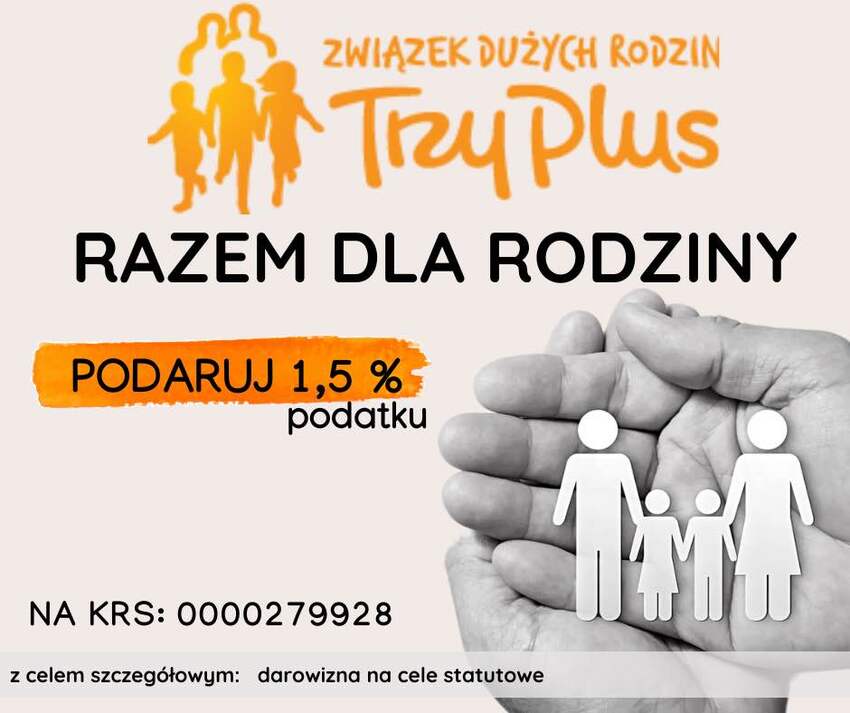Zachęcamy do przekazania 1,5% swojego podatku na działania Związku Dużych Rodzin 3 Plus.