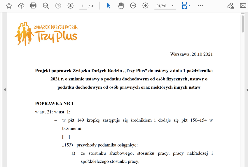 Związek Dużych Rodzin "Trzy Plus" przygotował projekt poprawek do ustawy PIT zgłoszonych do Senatu z uzasadnieniem. Poprawki formalnie zgłosili Senatorowie Jan Maria Jackowski i Antoni Mężydło w naszym imieniu na Senackiej Komisji Finansów 20 października 2021 r. Senat zapowiedział głosowanie nad poprawkami na bieżący tydzień.